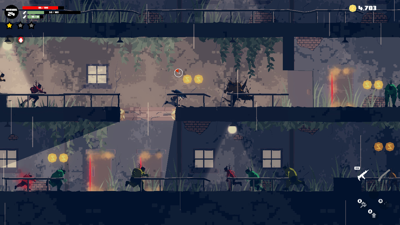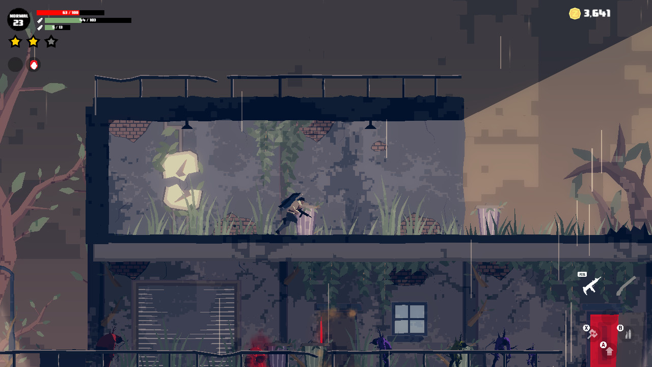 "Dead Rain - New Zombie Virus" - это экшен с боковой прокруткой от инди-разработчика Tiny devbox, в котором вам предстоит сражаться с волнами нежити, чтобы добраться до выхода из каждого этапа. Мир опустошен таинственным вирусом, распространяющимся через непрекращающиеся дожди и превращающим людей в зомби, из тел которых растут гротескные деревья. Вы играете за выжившего, который ищет свою потерянную дочь в этом апокалиптическом кошмаре, проходя 40 этапов, наполненных полчищами зараженных. Игра рассказывает свою историю визуально, не полагаясь на диалоги, позволяя мрачной атмосфере говорить самой за себя. Боевые действия вращаются вокруг комбинирования различных видов оружия и предметов, чтобы создать свой стиль боя, когда вы сталкиваетесь с различными типами зомби. Бесконечные дожди питают паразитическую растительность, прорастающую из зараженных, создавая тревожный фон при прохождении каждого уровня. Геймплей отличается отзывчивым управлением и динамичными действиями, когда вы бежите, уклоняетесь и прокладываете себе путь через толпы нежити. На каждом этапе вас ждут новые испытания и новые враги, которые не дадут вам заскучать в борьбе с зомби. Система кастомизации позволяет экспериментировать с различными вариантами снаряжения в соответствии с вашим стилем игры, будь то грубая сила или тактические удары.