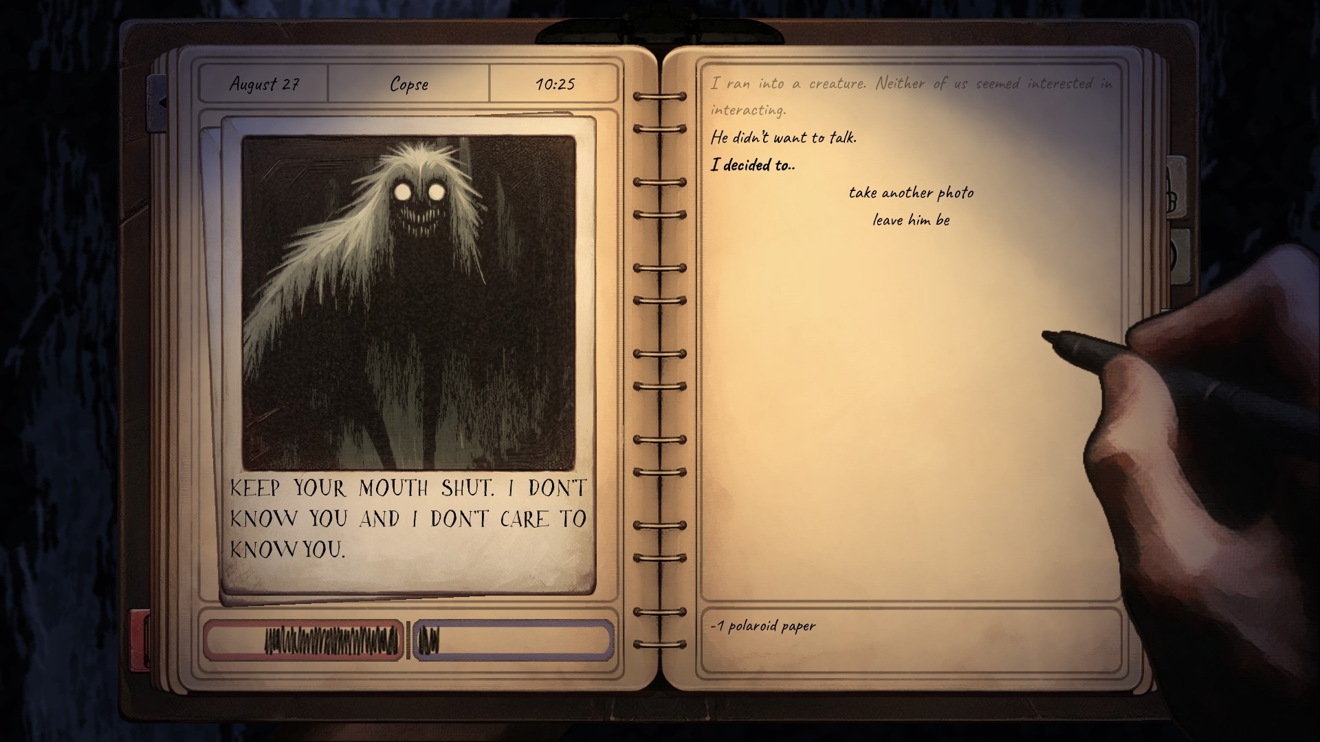 "Contra Spem Spero" - это приключенческий хоррор от инди-разработчика DADZINGO, в котором вы попадаете в кошмарный лес после того, как ваша машина глохнет на пустынной дороге. Вооружившись лишь дневником и камерой, вы пройдете через 42 основные и 13 скрытых локаций, используя интерактивную карту, и узнаете, почему это место существует и что случилось с его обитателями. Игра сочетает в себе текстовое исследование и визуальную новеллу, в которой существа, бывшие когда-то людьми, общаются через фотографии, которые вы делаете. Вам придется управлять двойной системой здоровья, решая различные головоломки и делая выбор, который разветвляет повествование на несколько концовок. Каждая встреча - с потерянными людьми, отчаявшимися существами или неописуемыми сущностями - открывает предысторию, которая влияет на ваш дальнейший путь, заставляя вас решать, кто заслуживает вашего доверия в месте, где доверие может быть невозможным. В игре использованы мрачные стилизованные фотографии, которые документируют ваше путешествие по локациям и чудовищам. Латинское название игры переводится как "Вопреки всем надеждам, я надеюсь", что как нельзя лучше передает атмосферу отчаяния. Обратите внимание, что в игре присутствуют мигающие огни и эффекты, которые могут вызвать светочувствительную эпилепсию.