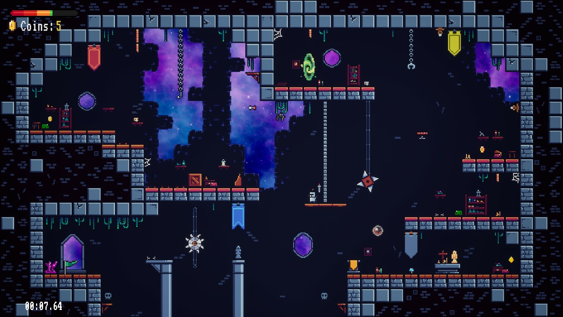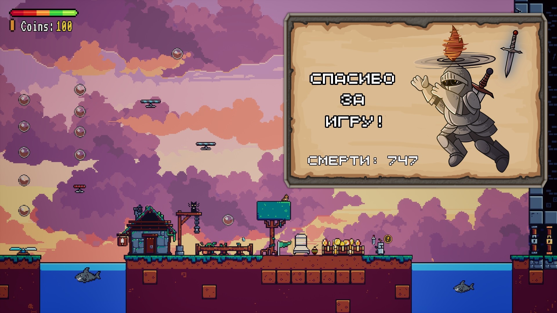 Отличительной особенностью игры является уникальная система полета, встроенная в шлем рыцаря, позволяющая парить и скользить по сложным участкам. Это воздушное перемещение придает традиционному платформеру новый смысл, позволяя вам творчески подходить к преодолению коварных препятствий. Повествование в игре представлено стильным пиксельным артом, передающим эстетику классических платформеров, и дополнено атмосферным саундтреком, который усиливает эффект от приключений.
