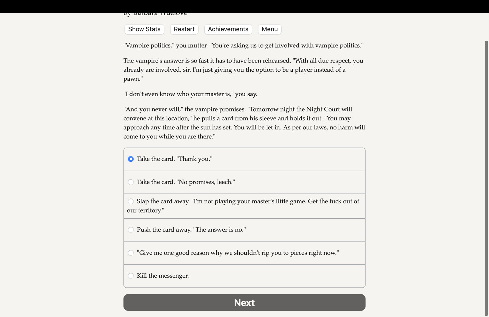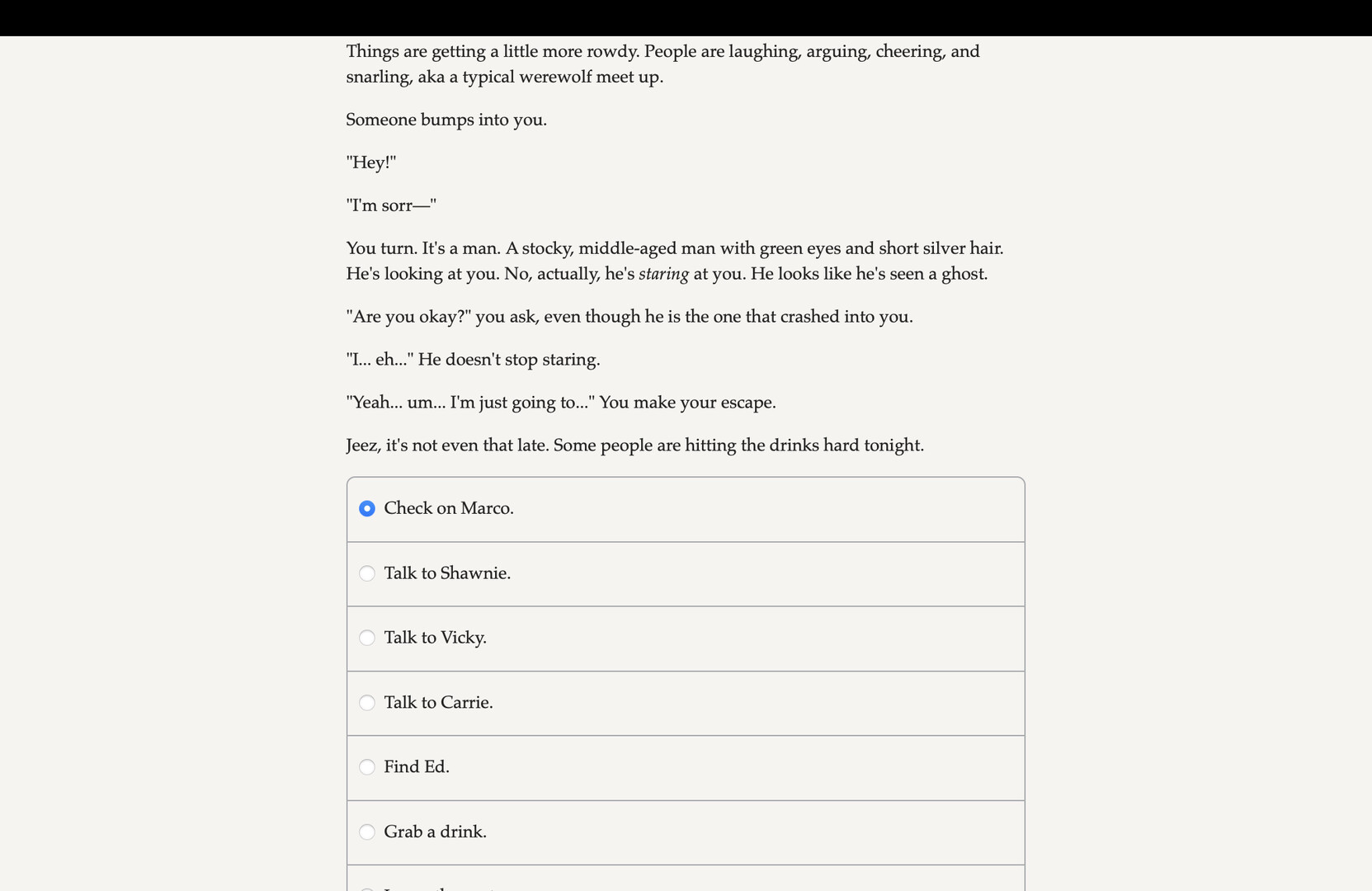 "Blood Moon" - это интерактивная текстовая ролевая игра объемом 445 000 слов, в которой вы играете за оборотня, перемещающегося по опасному городскому сверхъестественному миру, наполненному вампирами, ведьмами, охотниками и призраками. Игра погружает вас в паранормальный мир города после случайной встречи, заставляя принимать критические решения, от которых зависит как ваша судьба, так и судьба членов вашей стаи. Вы можете настроить гендерную идентичность и сексуальную ориентацию своего персонажа, а также завязать романтические отношения с восемью разными героями-оборотнями, каждый из которых предлагает уникальные сюжетные линии и интимные моменты. Игровой процесс вращается вокруг осмысленного выбора: сражаться с вампирами или договариваться с ними, вникать в политику вампирского двора или держаться в стороне, бороться за лидерство в стае или поддерживать претензии другого на звание альфы. Боевые и социальные столкновения позволят вам сражаться с призраками, сотрудничать с ведьмами и перехитрить охотников, отвоевывая территорию в городе. Чисто текстовый формат полностью зависит от вашего воображения, а разветвленные повествования ведут к нескольким концовкам и десяткам разблокируемых достижений. Ваши решения полностью меняют игровой мир и определяют, будет ли ваша стая процветать или падет перед городскими монстрами. Это глубокий опыт, основанный на выборе, для поклонников интерактивной фантастики и городского фэнтези.