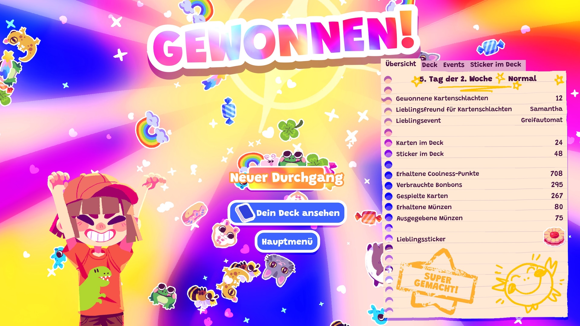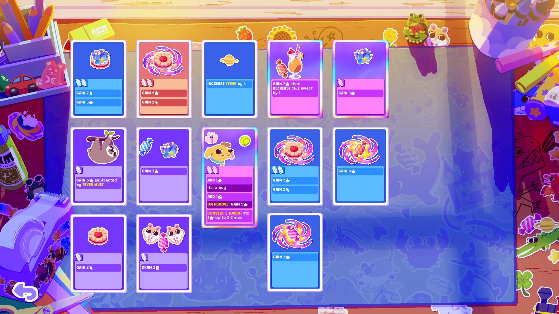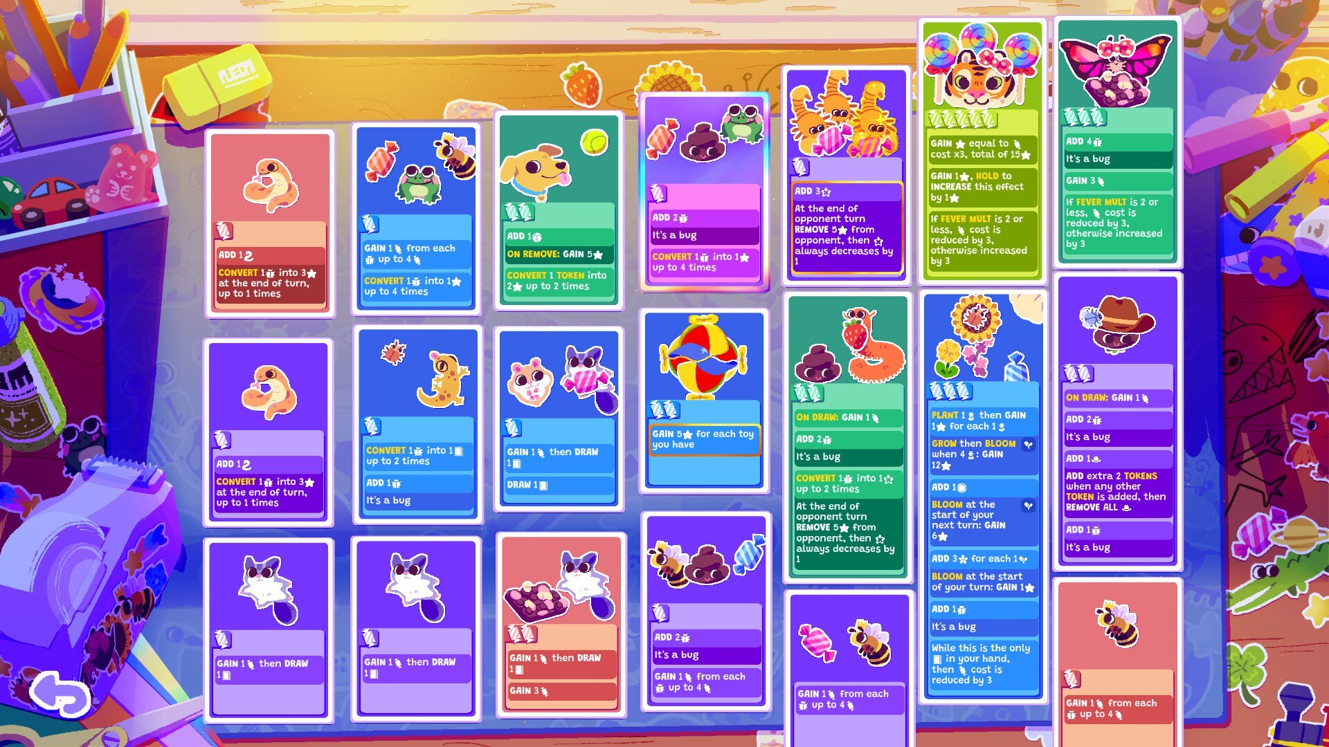 Основной геймплей заключается в сборе более 200 наклеек и комбинировании их эффектов для создания мощных синергий карт, хотя перегрузка карт делает их слишком дорогими для игры. Еженедельно вам предстоит сразиться с тремя сложными боссами, выбирая из 10 различных стартовых колод, которые определяют ваш начальный стиль игры и стратегию. В перерывах между сражениями игра предлагает разнообразные развлечения: поиск сокровищ, редких наклеек, управление клешневыми машинами для получения игрушек, синергирующих с вашей колодой, и участие в сюжетных событиях с друзьями-соседями.