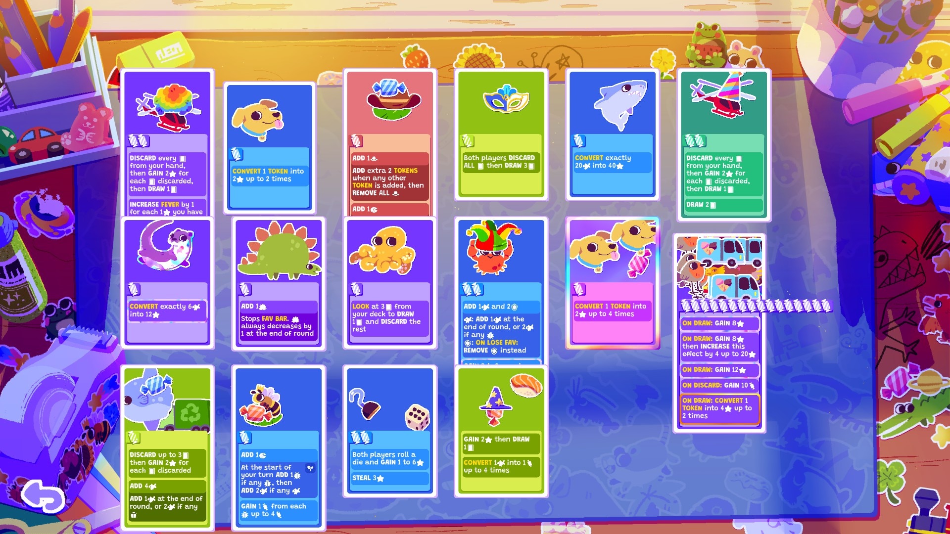 Каждый запуск представляет собой рандомизированное испытание с разными противниками и набором карт, поощряя эксперименты с новыми комбинациями и стратегиями. Система множителей FEVER добавляет тактической глубины, позволяя усиливать свои действия в решающие моменты сражений за "перетягивание каната крутизны". 15 тематических бустеров, более 40 коллекционных игрушек и специальные варианты наклеек, изменяющие механику геймплея, - игра предоставляет широкие возможности для кастомизации творческих колод.