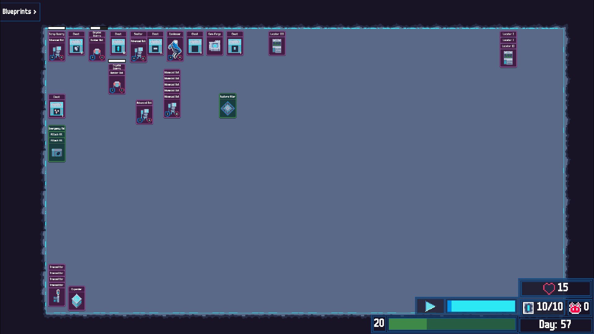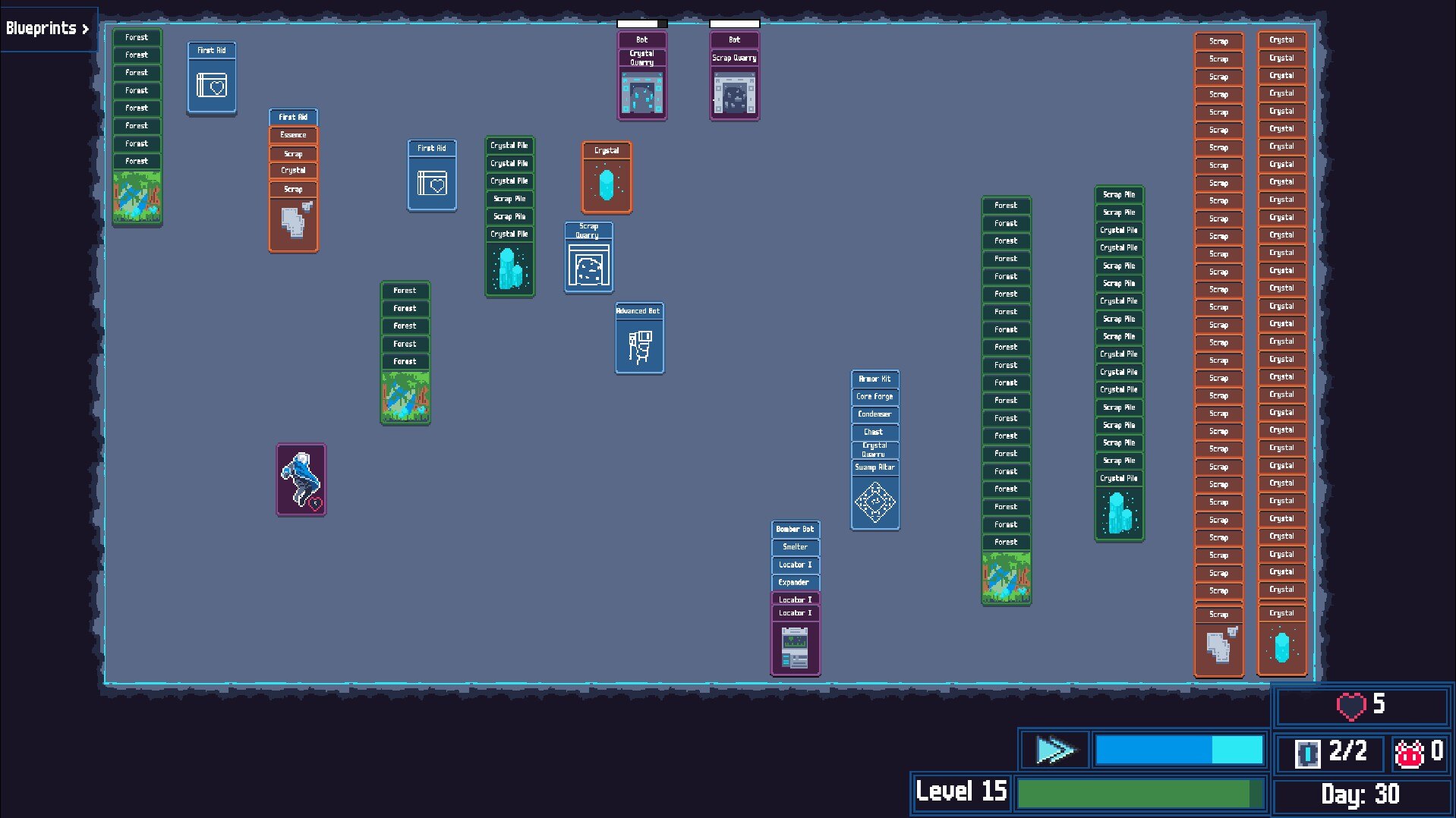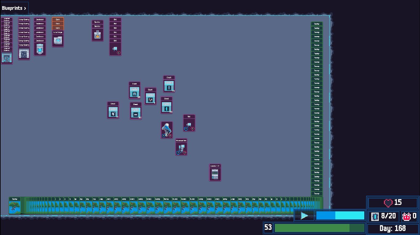 В игре есть три основные механики, которые способствуют прогрессу. Карты разведки позволяют вам отправиться в различные области, чтобы найти ресурсы, встретить врагов или наткнуться на случайные события, которые могут быть полезными или опасными. Бои происходят автоматически, когда карты игрока или бота помещаются на карты врага, при этом игроки могут объединяться с несколькими ботами против более сложных противников, таких как жуки и враждебные выжившие, чтобы повысить свои шансы. Система исследований вознаграждает каждое действие очками опыта, открывая новые чертежи и расширяя возможности ремесла по мере повышения уровня.