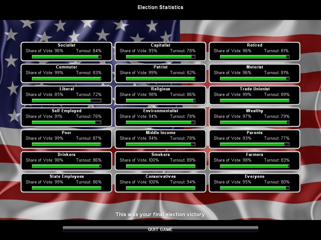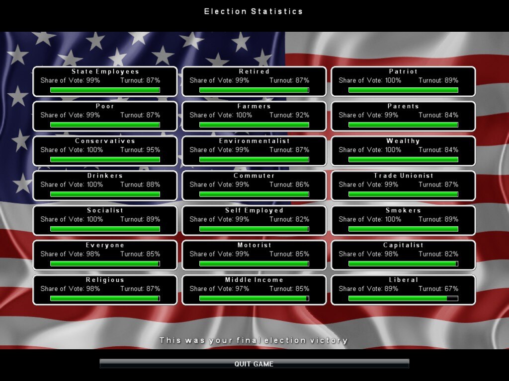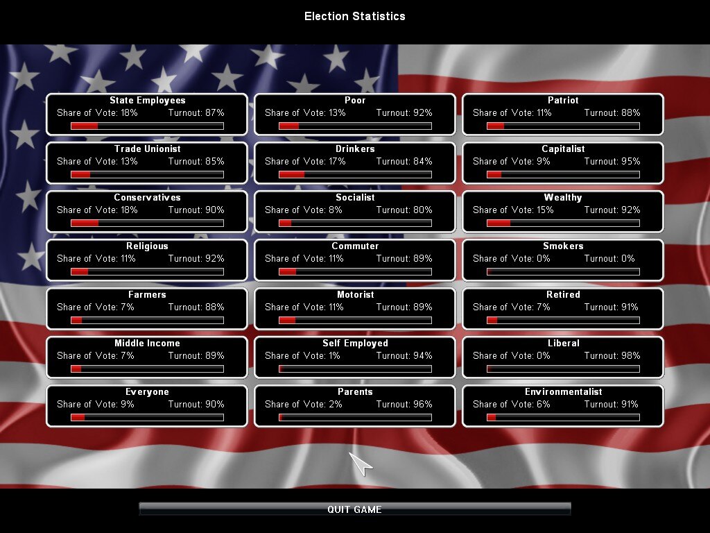 Основной геймплей вращается вокруг ползунков политики, которые позволяют вам простыми движениями регулировать работу правительства, охватывая все - от налоговых ставок и политики в области образования до прав трудящихся. Несмотря на сложную симуляцию, игра обладает доступным интерфейсом, который отображает взаимосвязи между всеми элементами при наведении на них курсора. Как пошаговая игра, она поощряет вдумчивое принятие решений, а не быстрые рефлексы.