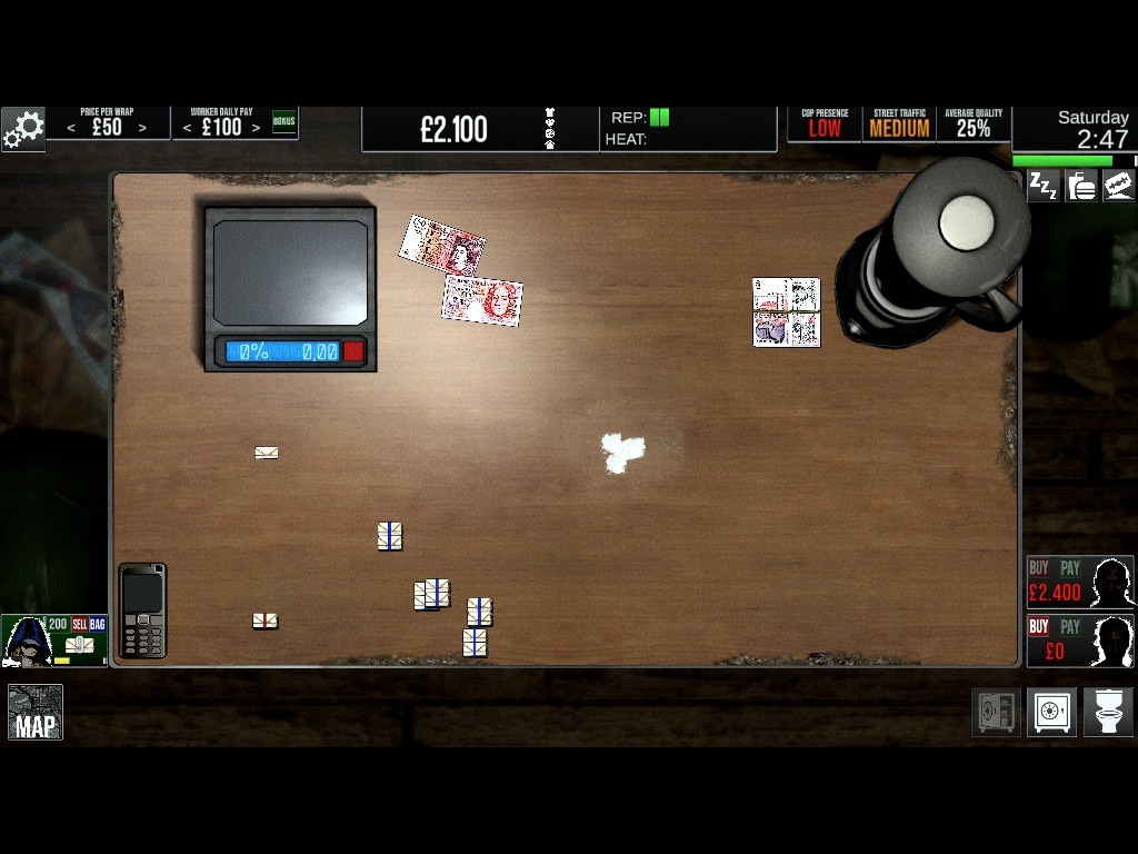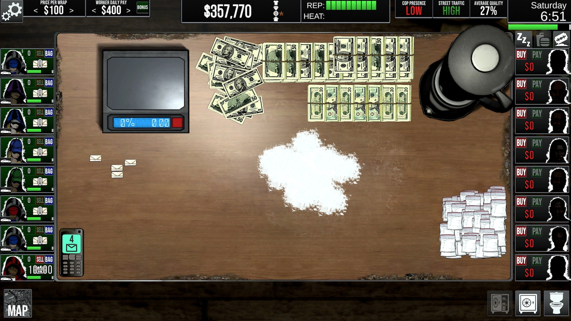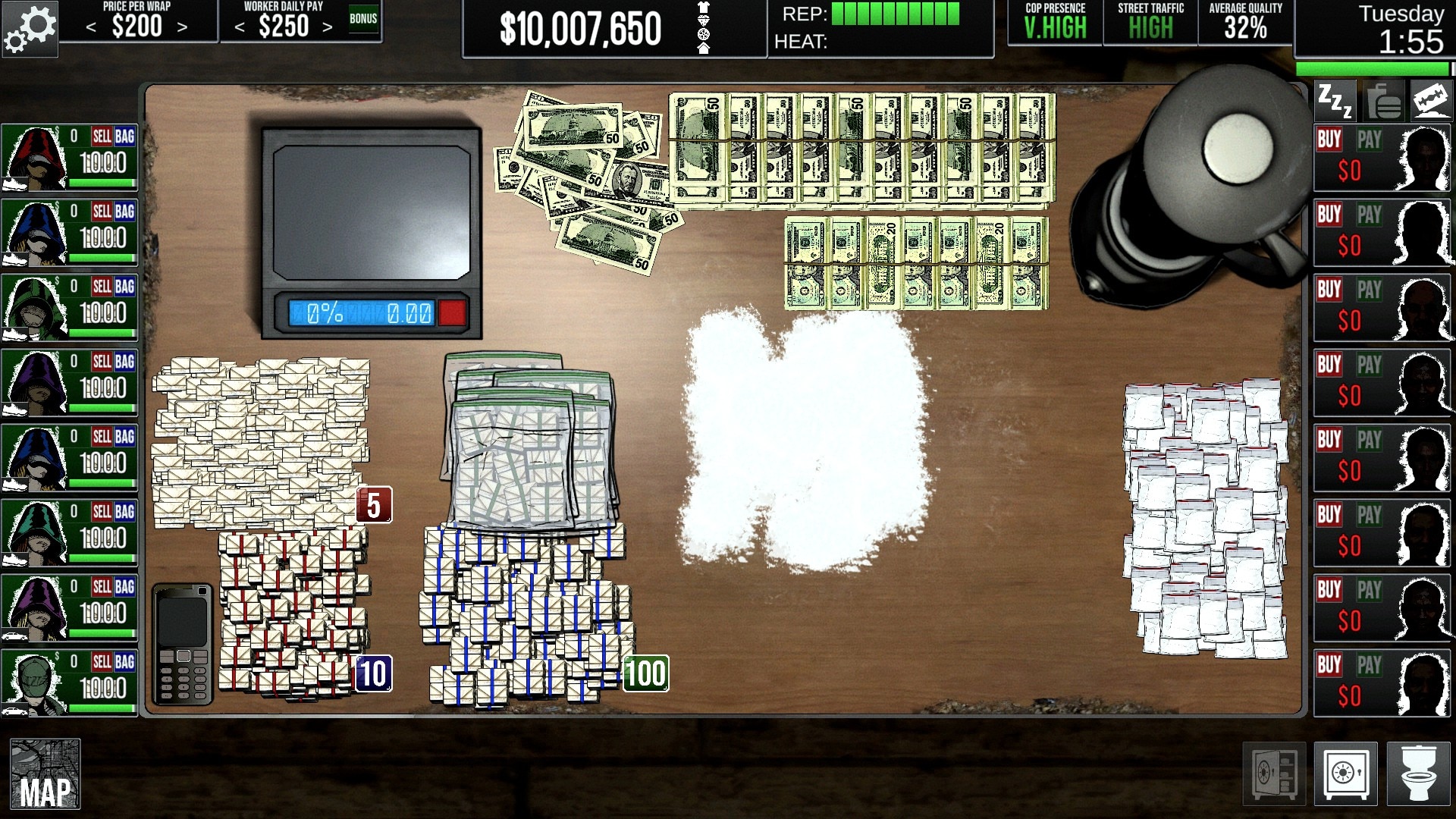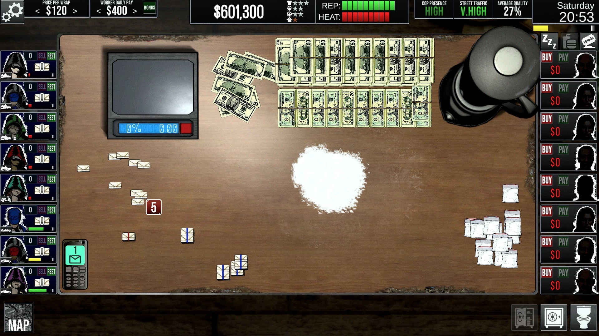 "Cocaine Dealer" - это стратегическая игра-симулятор от Stone/Spark Games, в которой вам предстоит окунуться в негламурную реальность управления нелегальным наркобизнесом. Вы начинаете с малого, имея базовое оборудование - унцию товара, весы и телефон - и пытаетесь расширить свое преступное предприятие, постоянно сталкиваясь с трудностями и рисками. В центре игрового процесса - взвешивание и упаковка товара, вербовка и управление уличными дилерами (которым грозит арест или еще что похуже), а также балансирование между спросом и предложением в разное время суток. Вам придется бороться с собственной усталостью от постоянных звонков клиентов, заключать сделки с опасными поставщиками и обслуживать растущую клиентуру, в которую входят высокооплачиваемые покупатели, ожидающие круглосуточной доступности. В игре есть возможность управлять ресурсами, модернизируя конспиративную квартиру, инвестируя в охрану и транспорт, а также тратить деньги на яркие символы статуса, такие как одежда и автомобили. В игре постоянно присутствует риск: от полицейских рейдов, которые заставляют вас спускать свои запасы, до возможности потерять все, что вы построили. Благодаря мрачному сатирическому тону и акценту на повторяющемся, высоконапряженном характере торговли, игра предлагает циничный взгляд на жизнь наркоторговцев, лишенную всякого гламура.