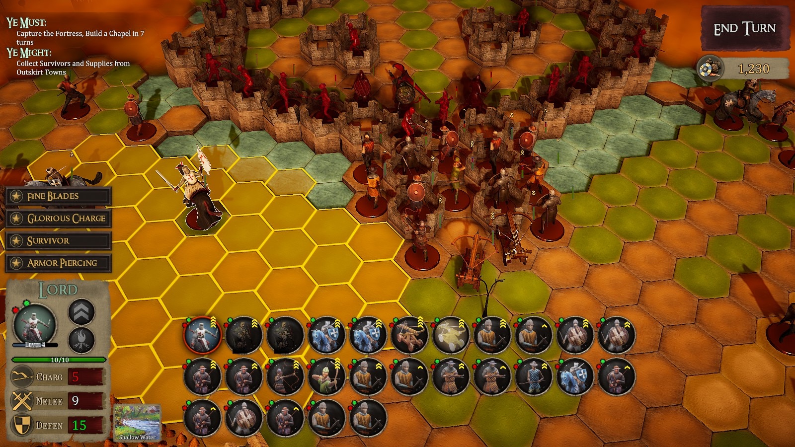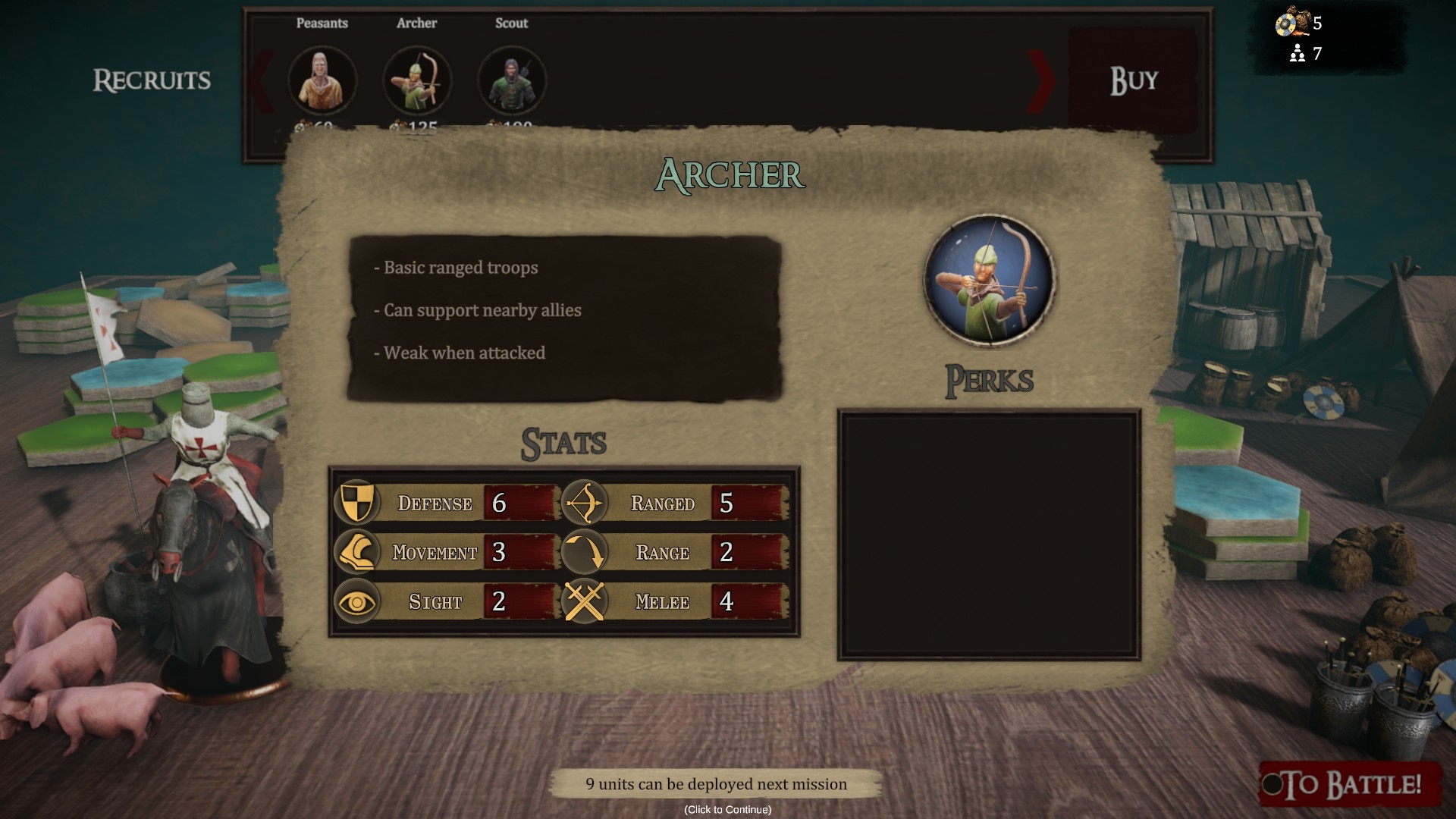 Игра требует тактической точности — формации должны противостоять кавалерийским атакам, а оборона замка требует тщательного планирования против демонических рыцарей и тяжелой пехоты. Бой вращается вокруг синергии юнитов: лучники поддерживают пехоту на передовой, стрелки разведывают засады, а кавалерия флангирует изолированных врагов, причем каждый из 26 подробно проработанных типов юнитов (солдаты, копейщики, баллисты, вооруженные люди) выполняет определенные роли на поле боя. Среди врагов есть любители засад Безголовые, быстрые Всадники-импы, тяжеловооруженные Рыцари-демоны и разрушительная Звериная кавалерия, которые требуют умного позиционирования и тактики пробивания брони.