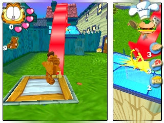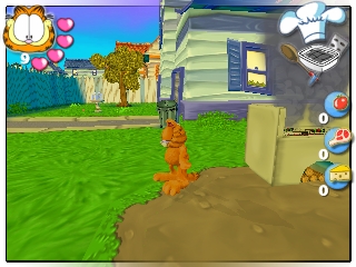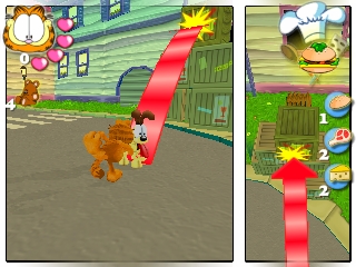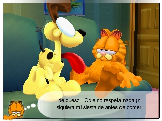 Помимо обычных движений, Гарфилд может получать особые способности, основанные на его привычках в еде: большие удары гамбургером, целебная лазанья и т.д. Вы не можете напрямую управлять непобедимым Оди, если только к нему не подсаживается второй игрок, но вы можете отдавать ему приказы, свистеть или пинать его. Вы даже можете перемещаться по воде, стоя на его голове. Во время игры важные сюжетные элементы рассказываются с помощью панелей в стиле комиксов, показывающих то, что Гарфилд не видит (например, чтобы показать вам переключатель между колодцами или скрытую дверь). Затем вы можете предпринять соответствующие действия (обычно они включают в себя пинок Оди), чтобы решить эти проблемы.