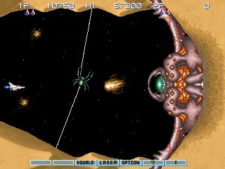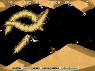 Vic Viper может быть усилен за счет ускорения, "двойных" выстрелов, которые добавляют выстрелы и/или потенциальные направления для стрельбы, различных типов ракет, лазеров и "опциональных" истребителей. Опционные истребители - это неразрушимые оранжевые шары, которые следуют за Vic Viper и добавляют ему огневой мощи. В игре есть несколько уровней сложности, а также возможность выбрать, с какого этапа начать.