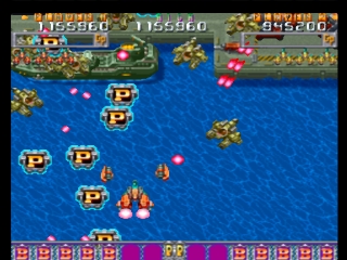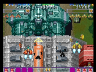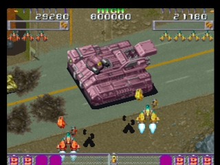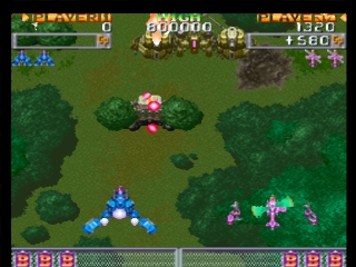 - Тип B: Зеленый (или фиолетовый, для второго игрока) вертолет, который стреляет из основных орудий вперед, а боковые орудия поворачиваются на 90 градусов относительно носа, когда истребитель движется горизонтально
