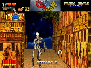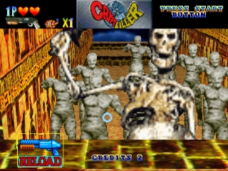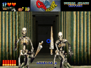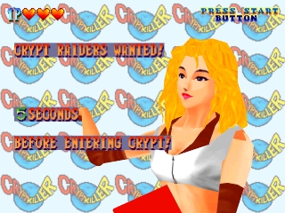 Crypt Killer - это порт одноименной аркадной игры, представляющей собой легкий пистолетный боевик в стиле таких игр, как Area 51 и Lethal Enforcers. В поисках легендарного "Глаза Путеводителя" игроки отправляются в путешествие по шести уровням, каждый из которых заражен волнами монстров, мутантов и нежити, которых необходимо уничтожить, чтобы продолжить путь. Изначально игрок вооружен дробовиком, но по ходу игры он может приобрести более мощное оружие, например пушку Гатлинга, автоматическую винтовку или гранатомет. Также в вашем арсенале есть умные бомбы, которые можно использовать, чтобы одним взрывом очистить экран от мелких врагов.