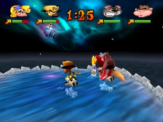 В другой игре персонажи оказываются на спинах белых медведей, которые пытаются столкнуть друг друга с айсберга, причем в разных вариантах есть тающий лед и углы игрового поля, которые меняются в зависимости от вашего местоположения. В каждой игре есть свои варианты, в некоторых можно играть вдвоем.