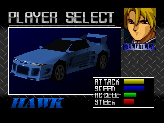 Вы можете выбрать один из 4 автомобилей: Spanker, Buffalo, Lynx, Hawk. Каждый из автомобилей различается по мощности атаки, максимальной скорости, ускорению и маневренности.