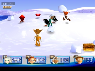 Матчи разделены на три раунда. Каждый раунд заканчивается, когда в живых остается один персонаж или когда все персонажи выбывают из игры, что приводит к ничьей. В конце раунда вам начисляются очки, основанные на прямых попаданиях, удаче и бонусе раунда. Прямые попадания - это то, что они означают, но не включают в себя большинство атак перчатками или урон от радиуса бомбы. Удача зарабатывается путем сбора белых сердец/облаков, которые появляются из деревянных ящиков. Бонус за раунд начисляется в зависимости от того, в каком порядке вы были уничтожены (первый уничтоженный получает 0 очков, остальные трое - разное количество очков). Побеждает тот, у кого в конце окажется больше всего очков.