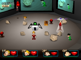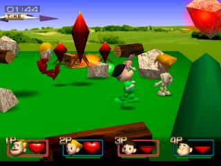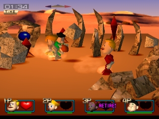 Поединки делятся на три раунда. Каждый раунд заканчивается, когда в живых остается один персонаж или когда все персонажи оказываются в нокауте, что приводит к ничьей. В конце раунда вам начисляются очки за прямые удары, удачу и бонус раунда. Прямые попадания - это то, что они означают, но не включают в себя большинство атак перчатками или урон от радиуса бомбы. Удача зарабатывается путем сбора белых сердец/облаков, которые появляются из деревянных ящиков. Бонус за раунд начисляется в зависимости от того, в каком порядке вы были уничтожены (первый уничтоженный получает 0 очков, остальные трое - разное количество очков). Побеждает тот, у кого в конце окажется больше всего очков.