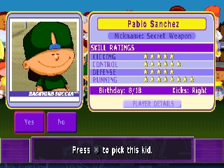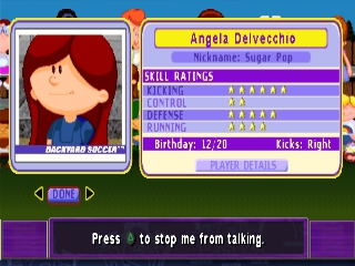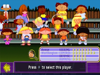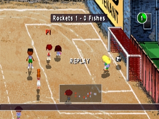 Backyard Soccer для PlayStation от Humongous Entertainment - это анимационная спортивная игра с участием мультяшных спортсменов младшего школьного возраста (обоих полов), составляющих футбольную команду. Одиночные игроки могут сражаться с компьютером, а с помощью PlayStation Multi-Tap на поле могут выйти до четырех игроков в комбинациях "голова к голове", "два на два" или "три против одного". В детском клубе игроки могут выбрать одиночную игру, игру мини-лиги или турнир, а также потренироваться в выполнении и блокировании штрафных ударов.