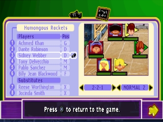 Перед началом игры можно выбрать состав команды, уровень сложности, игровое поле, а также конфигурацию контроллера. Игроки могут вручную выбрать каждого члена своей команды (или выбрать случайную команду), а также выбрать название команды и цвет формы. До и во время игры можно производить замены, а также выбирать тактику, стратегию и расстановку защитников. Если зайти в список команды, то на экране появится информация о том, как каждый выбранный персонаж будет реагировать на различные стратегии.