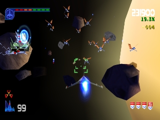 Как и в оригинальной игре, вы начинаете эту улучшенную версию Galaga, управляя кораблем, который движется горизонтально по нижней части игрового поля и стреляет вверх по волнам пикирующих, кружащихся инопланетян, которые в итоге слетаются в строй. Однако, в отличие от оригинала, в этой игре, в зависимости от того, какую миссию вы проходите, есть несколько других точек обзора, в том числе через плечо, сверху вниз и сбоку. Одновременно можно вести огонь только двумя выстрелами, но можно получить возможность вести огонь сразу тремя выстрелами.