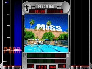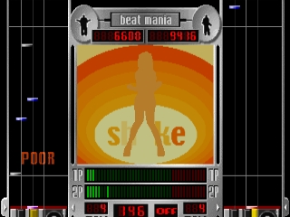 Каждая клавиша, как и вертушка, имеет соответствующую вертикальную полоску на экране. Полоски указывают путь, по которому прямоугольные иконки каскадом спускаются к горизонтальной линии в нижней части экрана. Игрок должен нажать соответствующую клавишу или повернуть проигрыватель, когда значок совпадет с линией, что приведет к запуску предустановленного звукового образца и перекомпоновке песни должным образом. Игроки оценивают точность нажатия каждой клавиши по шкале GREAT, GOOD, BAD и POOR. Удар по клавишам/царапанье, когда соответствующие ноты отсутствуют, уменьшает полоску, указывающую на удовлетворенность зрителей. Пройденный диапазон отображается на полосе в виде красной области справа, а зеленый - в виде провального диапазона слева. Игра может закончиться преждевременно, если полоса полностью исчерпана, но это зависит от индивидуальных настроек машины.