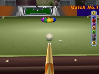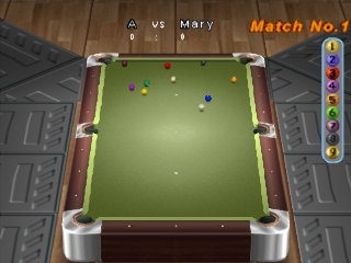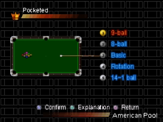 В игре American Pool издатель Mud Duck предлагает бюджетный виртуальный 3D-бильярд с тремя режимами игры на PlayStation. В режиме обучения игроки изучают управление и различные техники игры в пул, решая задачи и проблемы, а в режиме карманной игры предлагают пять видов пула, включая 9-шары, 8-шары, базовый, вращение и стойку 14-1. Последний режим, Pool Contest, представляет собой турнир по 9-шарам, в котором игроки создают своего персонажа и по мере продвижения по турнирной таблице улучшают его, используя специальные удары и приемы.