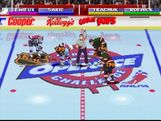 Каждый раз, когда вы перехватываете, проверяете, забиваете или ассистируете, ваш "горячий счетчик" будет заряжаться. Как только он достигнет максимума, вы будете в огне! Это значит, что ваши броски будут более точными и скоростными. Если у вас есть карта памяти, игра будет отслеживать десять лучших пользователей по наибольшему количеству сыгранных игр, лучшему проценту побед и наибольшему количеству очков. Среди других особенностей игры - оцифрованное табло, пять уровней сложности, регулируемая продолжительность периода от одной до девяти минут, нормальный или большой размер головы, игра вдвоем или в кооперативе, а также режим турнира. Так чего же вы ждете? Пришло время положить "бисквит в корзину"! NHL Open Ice для PlayStation - это перевод аркадной игры Open Ice от Midway 1995 года.