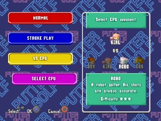 Putter Golf - это 3D-симулятор мини-гольфа. В нем есть как "обычное" поле на 9 лунок с реалистичными полями, так и "трюковое" поле на 9 лунок с несколько более необычными элементами, такими как зоны искривления и конвейерные ленты. В комплекте есть режим "микс" со случайным выбором лунок с обоих полей, а также режим тренировки, позволяющий потренироваться в ударах на различных склонах и опробовать возможности режима "трюк".