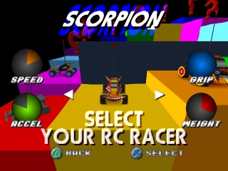 Радиоуправляемые автомобили учитывают такие характеристики, как скорость, ускорение, сцепление с дорогой и вес. В начале игры на выбор предлагаются четыре машины: если Krush обладает средними характеристиками, то Flame Dragon - невероятной управляемостью и ускорением. Трассы включают в себя сюрреалистическое окружение, такое как прибрежные гоночные трассы, горная местность и пустыня.
