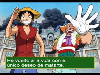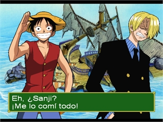 Это первый файтинг для Playstation, основанный на манге и аниме One Piece. One Piece - это аниме, начавшееся в 2001 году, я знаю, что сначала это была манга. Но как бы то ни было, в нем рассказывается о мальчике, который собирается стать королем пиратов Монки Д. Луффи, и его пиратской команде, состоящей из мечника с тремя мечами (Зоро), воровки/навигатора (Нами), лжеца/стрелка (Усоп) и повара/боевого мастера (Санджи). Все они направляются в Гранд Лайн, где легендарный король пиратов спрятал главное сокровище - ОДНУ ШТУКУ.