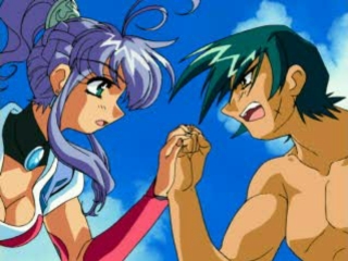 Через несколько мгновений появляются гигантские роботы, и таинственная девушка просыпается, она понимает, в какой опасности они находятся, берет мальчика за руку и дает ему силу пилотировать вместе с ней гигантского робота, а Хазуки тем временем падает на пол вдали от них.