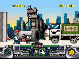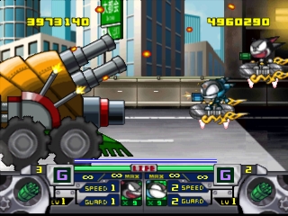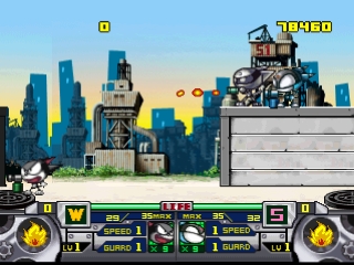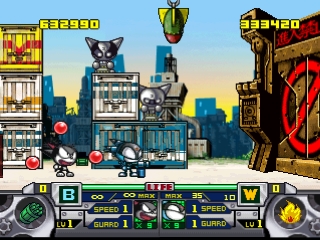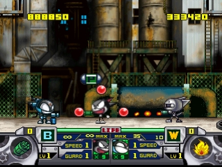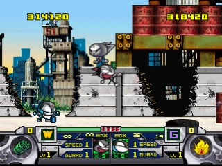 Вам доступно шесть видов оружия: обычный выстрел (не требует патронов), пламя (поджигает предметы), меч (огромный урон), бомба (большой радиус взрыва), удар (более мощная пушка) и стук (стандартное оружие ближнего боя). Каждое из этих оружий можно перевести в новую оригинальную форму с помощью небольших капсул, разбросанных по уровням. Учитывая, что у каждого из трех персонажей есть уникальное оружие и каждый трансформируется с помощью бонусов
