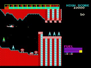 Scramble (1981) - это шутер с боковой прокруткой (слева направо), в котором вы стреляете по вражеским ракетам и сбрасываете на них бомбы. Ракеты взлетают с поверхности гористой инопланетной планеты. Вы должны периодически заправлять свой корабль, уничтожая топливные баки, появляющиеся на поверхности планеты. Super Cobra (1981) - продолжение Scramble и очень похожа на нее.