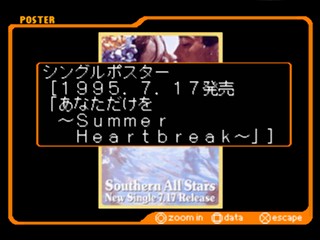 Southern All Stars: Space MOSA "Space Museum of Southern Art" - это база данных группы Southern All Stars, в которой представлены фотографии, тексты и песни группы, а также некоторые концертные видео и видеоклипы на 43 сингла. Программа разделена на 3 разных диска. Диск 1 - это музей, диск 2 - библиотека и диск 3 - театр.