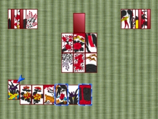 Игра: Игра начинается с дилера. Игрок берет карту, которую ему сдали, и сопоставляет масть с картой, которая лежит на столе. Если подходящей карты нет, игрок сбрасывает карту в центр стола. Затем верхняя карта колоды переворачивается лицевой стороной вверх, и если на игровом поле есть карта подходящей масти, игрок забирает ее себе, в противном случае карта колоды добавляется на игровое поле.