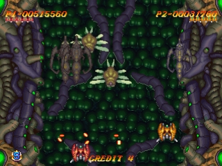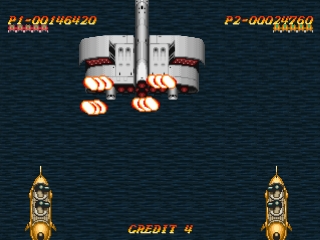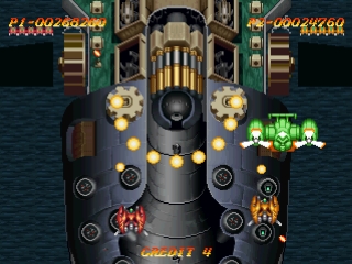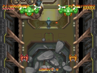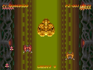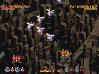 Two Tenkau - это вертикально прокручивающийся шутер с тремя кораблями, каждый из которых имеет свое уникальное оружие, но именно умные бомбы выделяют его на фоне остальных, появляющихся в виде гигантского воплощения Будды, испепеляющего всех и вся.