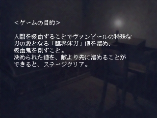 Vampir Kyuuketsuki Densetsu (Vampir Tales of the Bloodsuckers) - это ролевая игра с изометрическим видом, в которой игрок управляет вампиром, оказавшимся в небольшом городке в XIX веке. Игра разделена на 2 части: Днем персонаж игрока (молодой вампир по имени Кристофер) должен разговаривать с жителями города и завоевывать их доверие, а ночью персонаж должен сосать их кровь.
